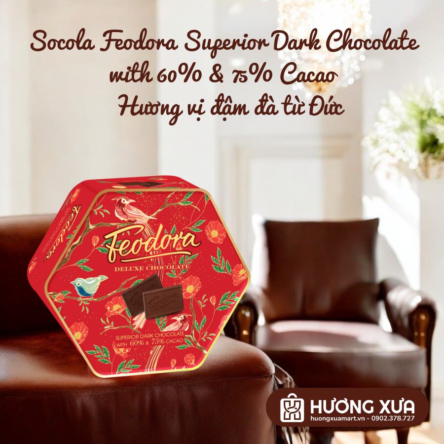 Feodora Superior Dark Chocolate từ Đức là một trong những sản phẩm đỉnh cao của nghệ thuật làm socola, đặc biệt dành cho những ai yêu thích socola đen đậm vị. Với hai lựa chọn 60% và 75% cacao, sản phẩm này mang đến sự đa dạng cho người thưởng thức, từ vị đắng vừa phải đến đắng sâu sắc, đậm đà.