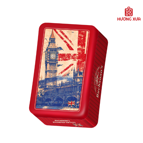 - Điểm nhấn ấn tượng đầu tiên của kẹo toffees Buchanan’s 120g chính là bao bì hộp sắt màu đỏ nổi bật.