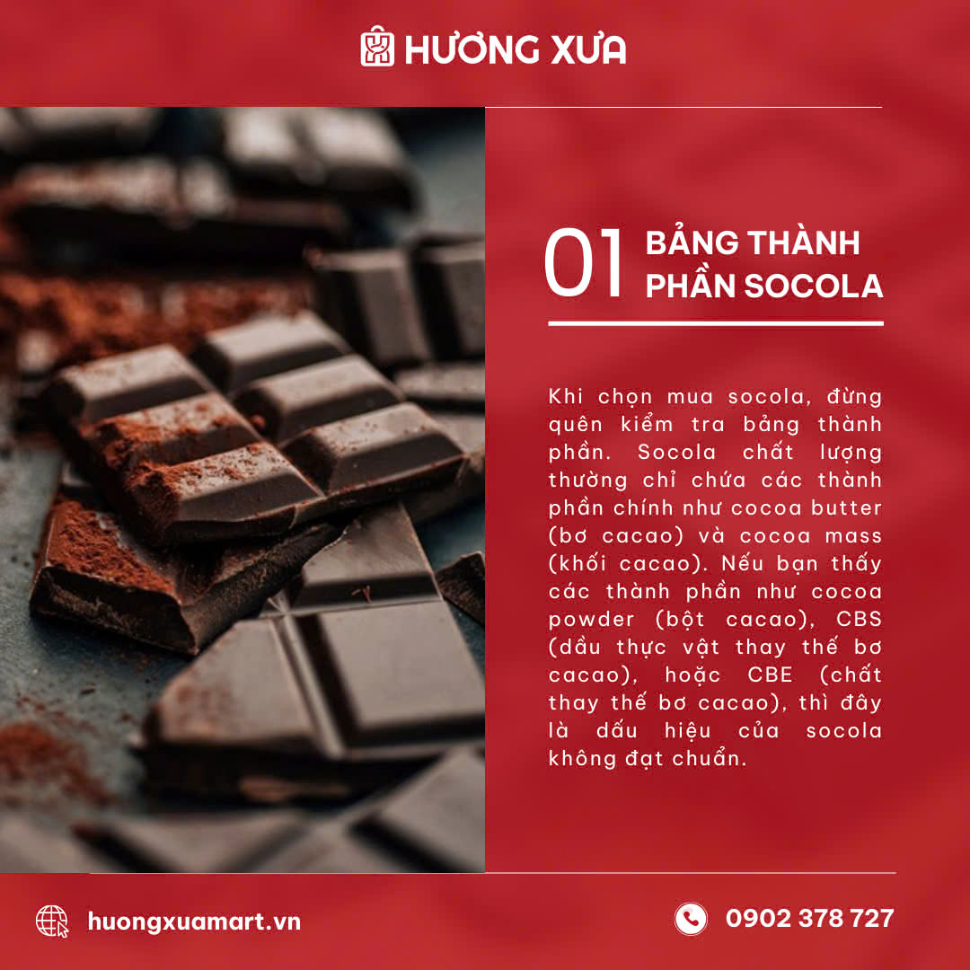 Một trong những yếu tố đầu tiên và quan trọng nhất khi chọn mua socola chính là kiểm tra thành phần trên bao bì. Socola chất lượng cao thường chỉ chứa các thành phần cơ bản như: