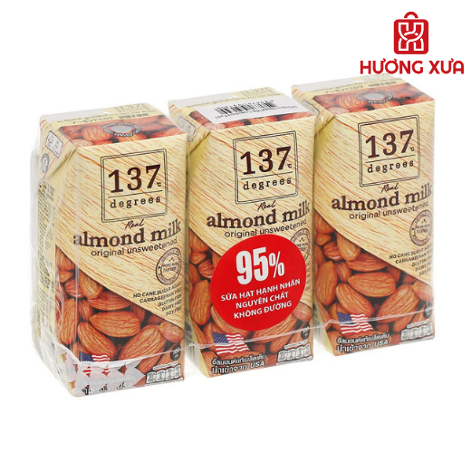 Lốc 3 hộp sữa hạnh nhân không đường 137 Degrees 180ml có bảng thành phần chính bao gồm: Sữa hạt hạnh nhân (95%), chiết xuất hạt hướng dương (5%). Ngoài ra, Sản phẩm cung cấp khoảng 60 calo trên 180ml sữa.