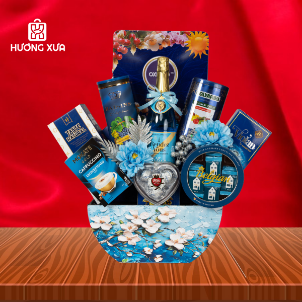 - Điểm nhấn: Sự kết hợp tinh tế giữa sắc xanh dương và các sản phẩm cao cấp tạo nên giỏ quà vừa trang nhã vừa đậm chất phương Đông, thích hợp để tặng đối tác và khách hàng quan trọng.