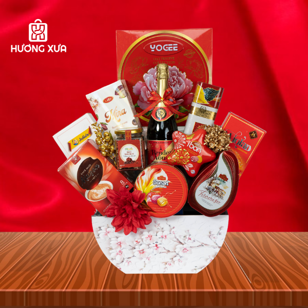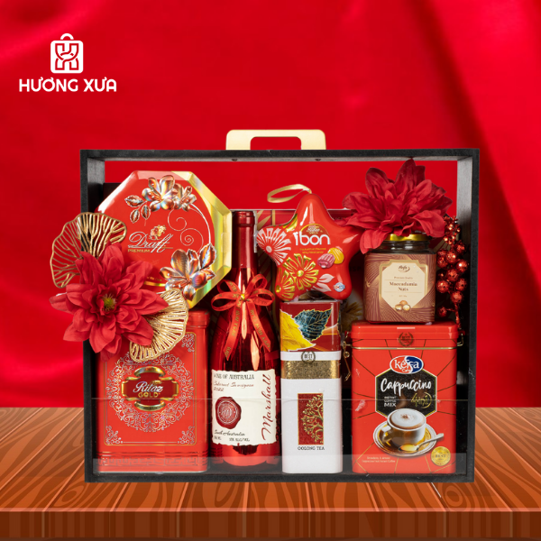 - Điểm nhấn: Thiết kế sang trọng với sắc đỏ rực rỡ, giỏ quà là lựa chọn hoàn hảo để gửi đến đối tác và khách hàng, thay cho lời chúc một năm mới may mắn và thành công.