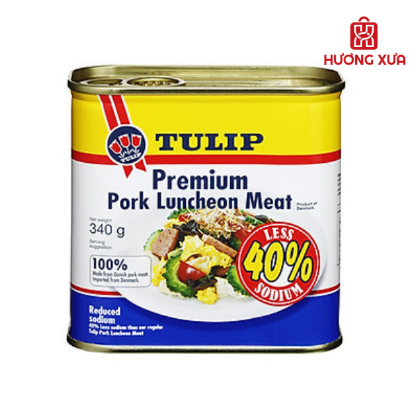 Thịt Heo Hộp Tulip Pork Luncheon Meat 40% Less Sodium 340g - Tiện Lợi, Ngon Miệng, Giảm 40% Hàm Lượng Muối, Khối Lượng 340g